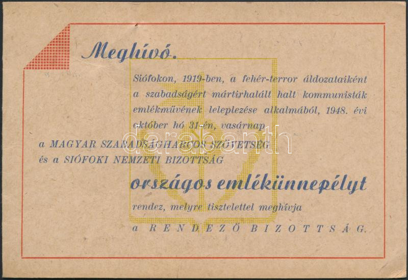 Leírás: 1919 Siófok, Meghívó a szabadságért mártírhalált halt kommunisták emlékművének leleplezése alkalmából rendezett emlékünnepélyre