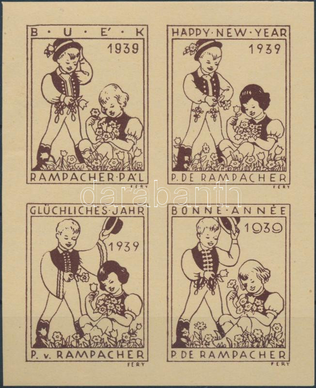 1939 Rampacher Pál: Újév négy nyelvű levélzáró négyestömb https://www.darabanth.com/hu/251-Gyorsarveres/251.0/Festmeny-mutargy-papirregiseg-egyeb/Parafilatelia~600021/1939-Rampacher-Pal-Ujev-negy-nyelvu-levelzaro-negyestomb~II1211017
