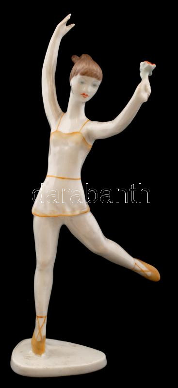 Leírás: Hollóházi táncoló lány virággal, jelzett, kézzel festett, apró kopásnyomokkal, m: 27 cm