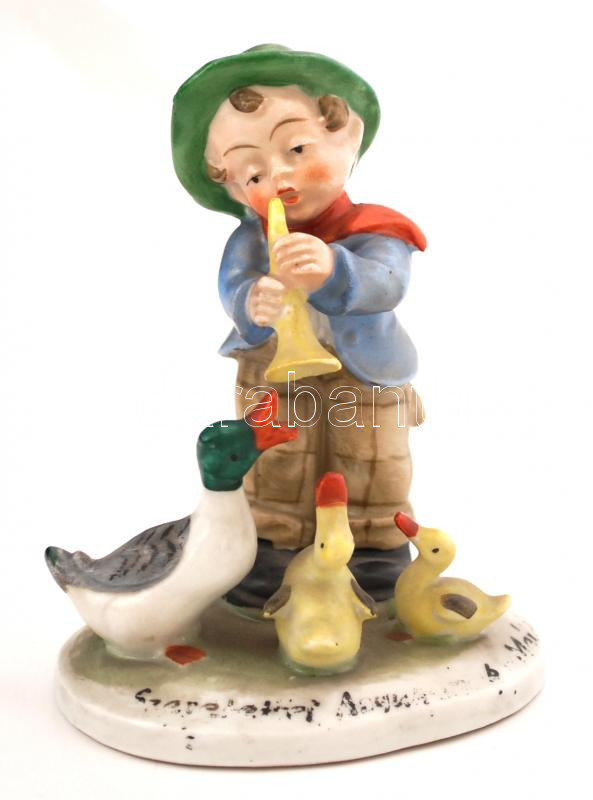 Leírás: Kisfiú a kacsákkal, kézzel festett, jelzés nélkül, javított, m:10,5 cm