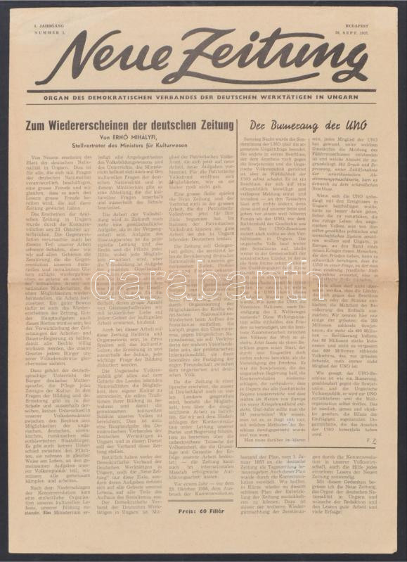 1957 A Neue Zeitung c. magyarországi német nyelvű újság 1. induló szám... https://www.darabanth.com/hu/251-Gyorsarveres/251.0/Festmeny-mutargy-papirregiseg-egyeb/Ujsagok-elso-szamai~600012/1957-A-Neue-Zeitung-c-magyarorszagi-nemet-nyelvu-ujsag-1-indulo-szama~II1214615