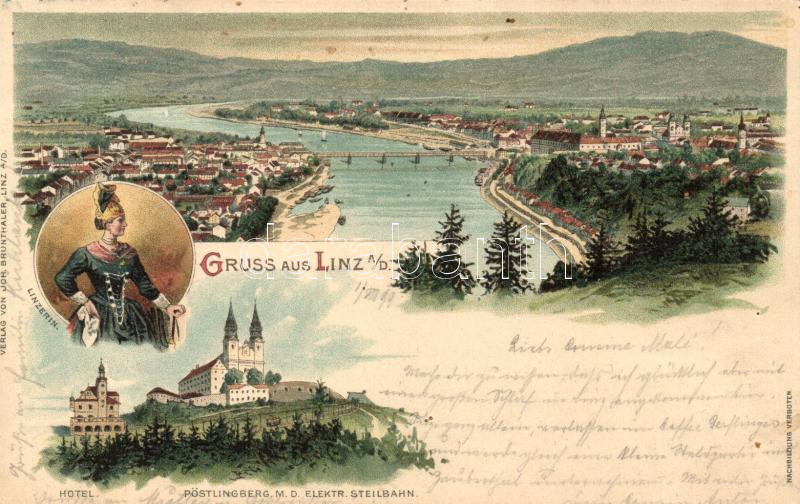 Leírás: 1899 Linz, Hotel, Pöstlingberg, Elektrische Steilbahn, Linzerin / hotel, hill, electric funicular, verlag von Joh. Brunthaler, litho