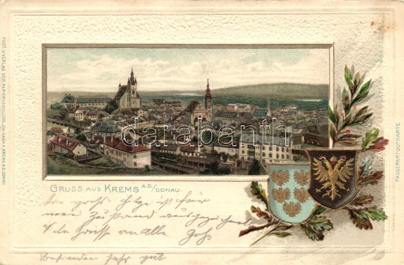 Krems an der Donau, coat of arms, Passepartoutkarte litho (EK) https://www.darabanth.com/hu/251-Gyorsarveres/251.0/Kepeslapok/Ausztria~400085/Krems-an-der-Donau-coat-of-arms-Passepartoutkarte-litho-EK~II1211291