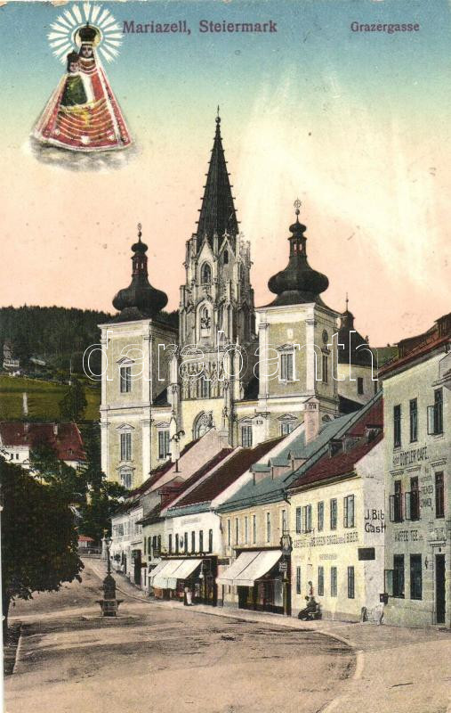 Leírás: Mariazell, Grazergasse, Gasthof zum Weissen Engel des J. Bieber, Dorfler Cafe / street, guest house, cafe (EK)