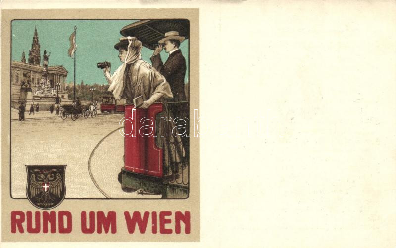 Leírás: Vienna, Wien; Rund um Wien, Salonwagen-Rundfahrten der Wiener stadtischen Strassenbahnen / tram trip advertisement, litho
