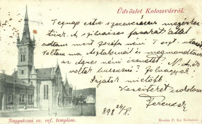 1898 Kolozsvár, Cluj; Nagy utca, Református templom, kiadja Kovács P. ... https://www.darabanth.com/hu/251-Gyorsarveres/251.0/Kepeslapok/Erdely~400006/1898-Kolozsvar-Cluj-Nagy-utca-Reformatus-templom-kiadja-Kovacs-P-fiai-street-Evangelic-ch~II1212967