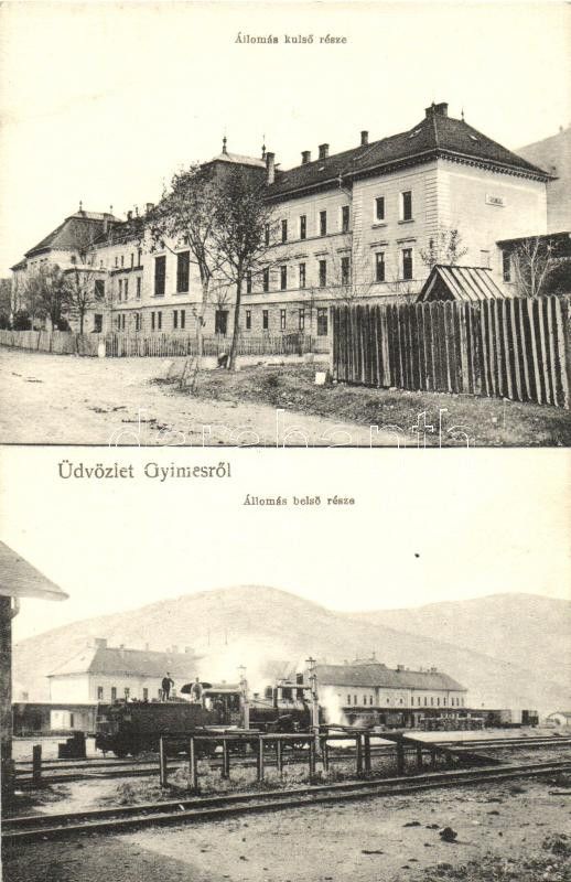Leírás: Gyimes, Ghimes; vasútállomás, vonat, kiadja Markovits Náthánné / railway station, train