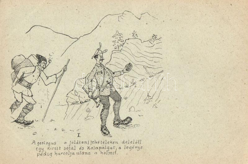 Leírás: Geológus, humor 'A geologus a földtani felvételeken' / Geologist, humour