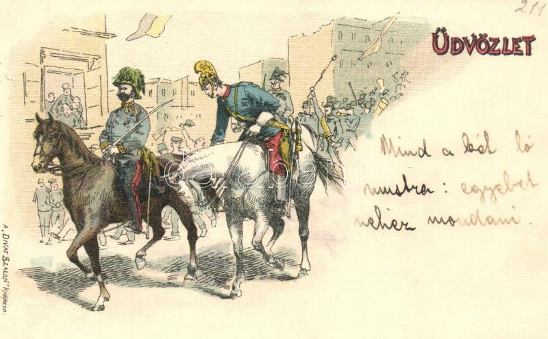 Leírás: 1898 Magyar honvéd huszárok; Üdvözlet, a Divat Szalon kiadása / Hungarian hussars 'Grüss aus...' litho