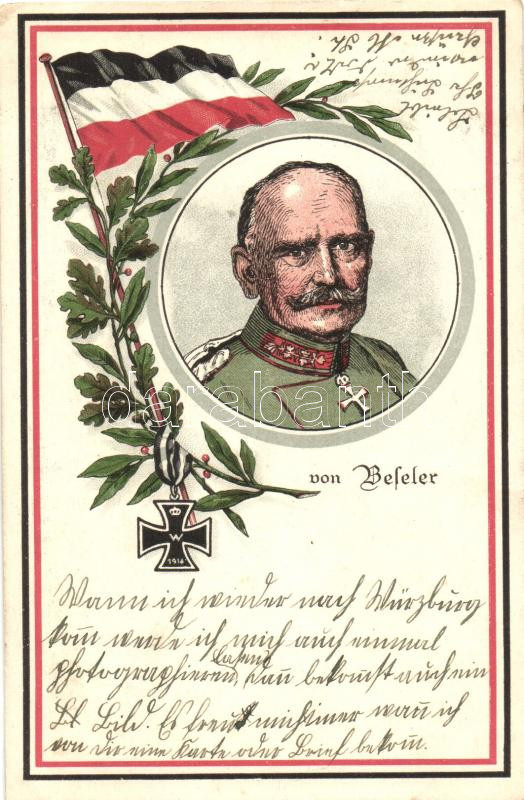 Hans Hartwig von Beseler, German flag, litho (EK) https://www.darabanth.com/hu/251-Gyorsarveres/251.0/Kepeslapok/Katonai~400063/Hans-Hartwig-von-Beseler-German-flag-litho-EK~II1213304