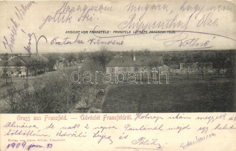 Leírás: Ferenchalom, Franzfeld; látkép Pancsova felől, kiadja Adam Müller / town-view from Pancsova (EK)