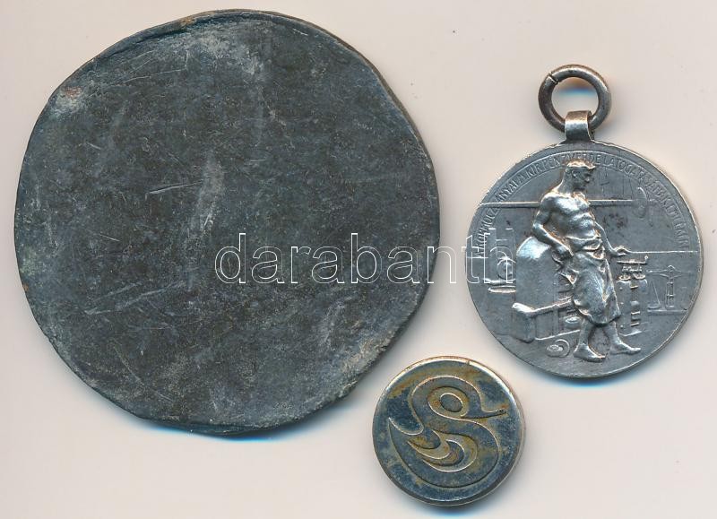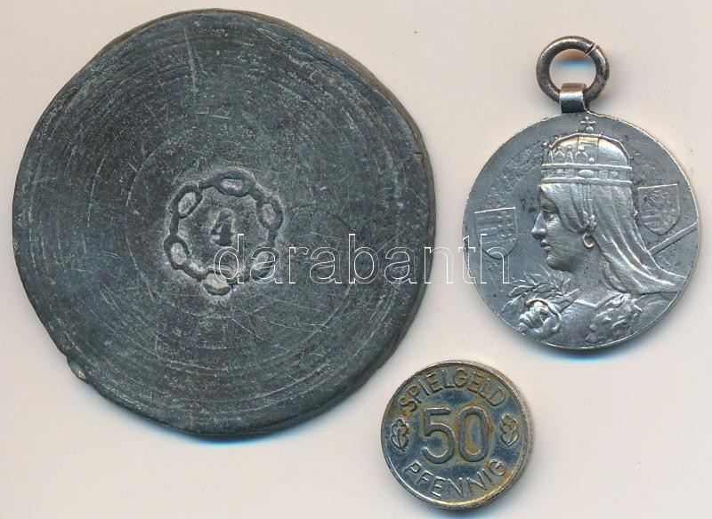 ~1920-1930. "A Körmöcbányai Magyar Királyi Pénzverde látogatásának emlékére" jelzetlen Ag medál (5.84g/22mm) + ón zseton és német 50 Pfennig fém játékpénz T:2-3