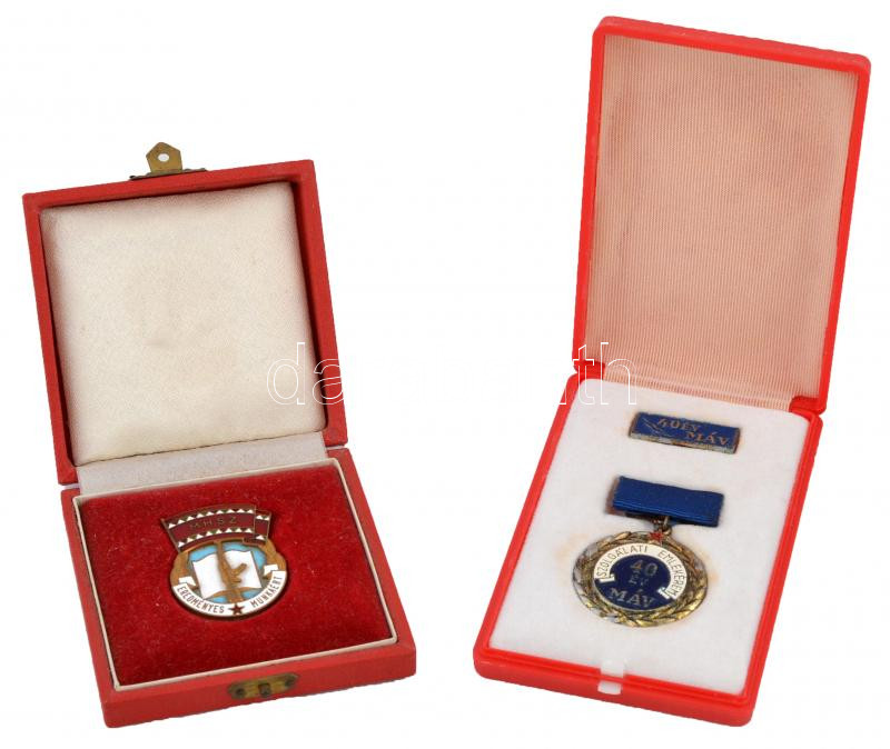 Leírás: ~1970. "MHSZ eredményes munkáért" zománcozott jelvény eredeti dísztokban + "MÁV Szolgálati Emlékérem 40 év után" zománcozott fém jelvény eredeti dísztokban T:2