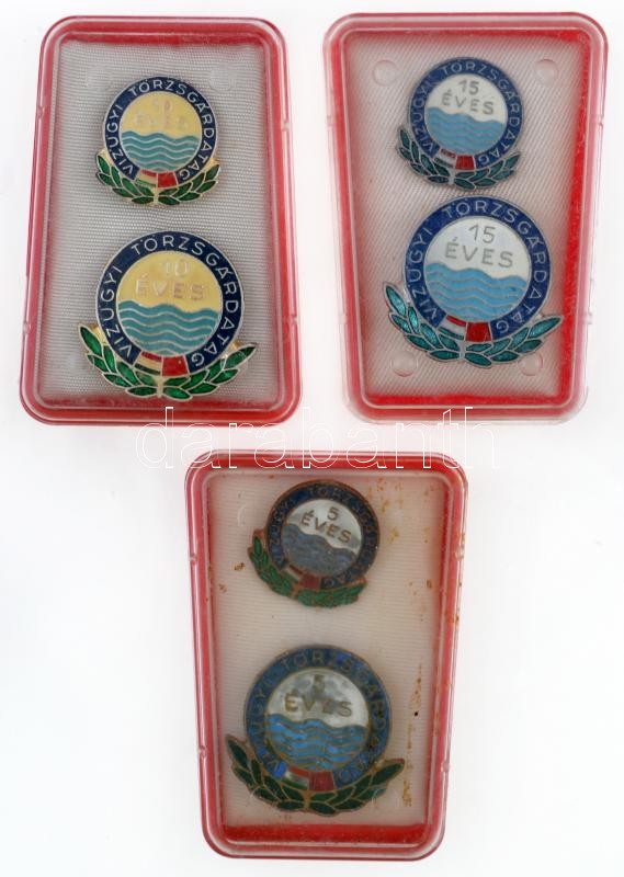Leírás: ~1970. "Vízügyi Törzsgárda 5+10+15 éves" 3db zománcozott jelvény, mindegyik miniatűrrel tokban T:1,1-,2