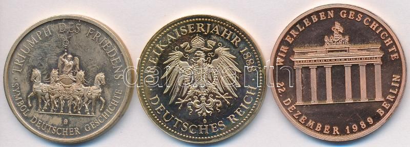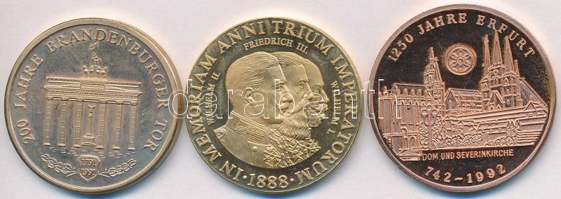 Németország 1991. "200 éves a Brandenburgi kapu" aranyozott Cu-Ni emlékérem tanúsítvánnyal (30mm) + 1992. "1888 a három császár éve" aranyozott tombak emlékérem tanúsítvánnyal (30mm) + "Erfurt 1250 éves" Br emlékérem (32mm) T:PP,2(PP) ujjlenyomat