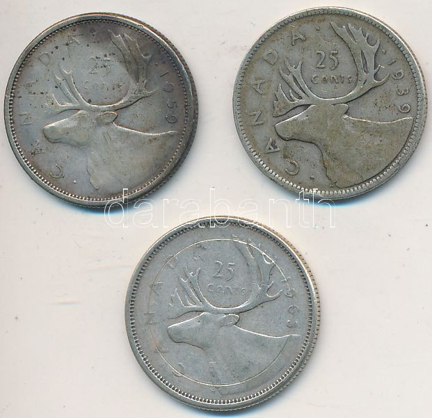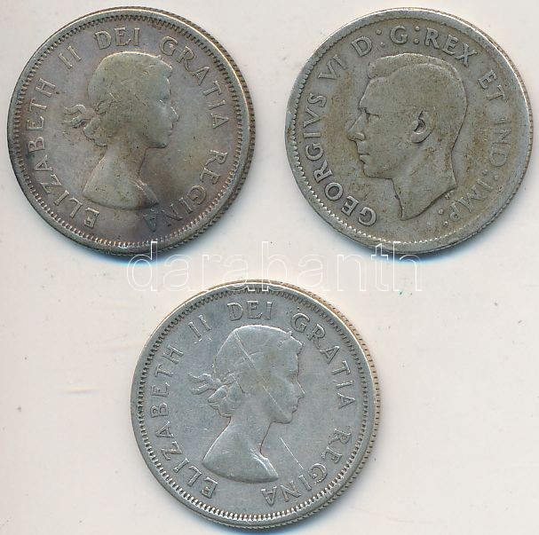 Kanada 1939. 25c Ag "VI. György" + 1959. 25c Ag + 1963. 25c ... https://www.darabanth.com/hu/251-Gyorsarveres/251.0/Numizmatika/Kulfoldi-fem-es-ezustpenzek~12/Kanada-1939-25c-Ag-VI-Gyorgy-plus-1959-25c-Ag-plus-1963-25c-Ag-II-Erzsebet-T2-3-karc-patina--~II1210042