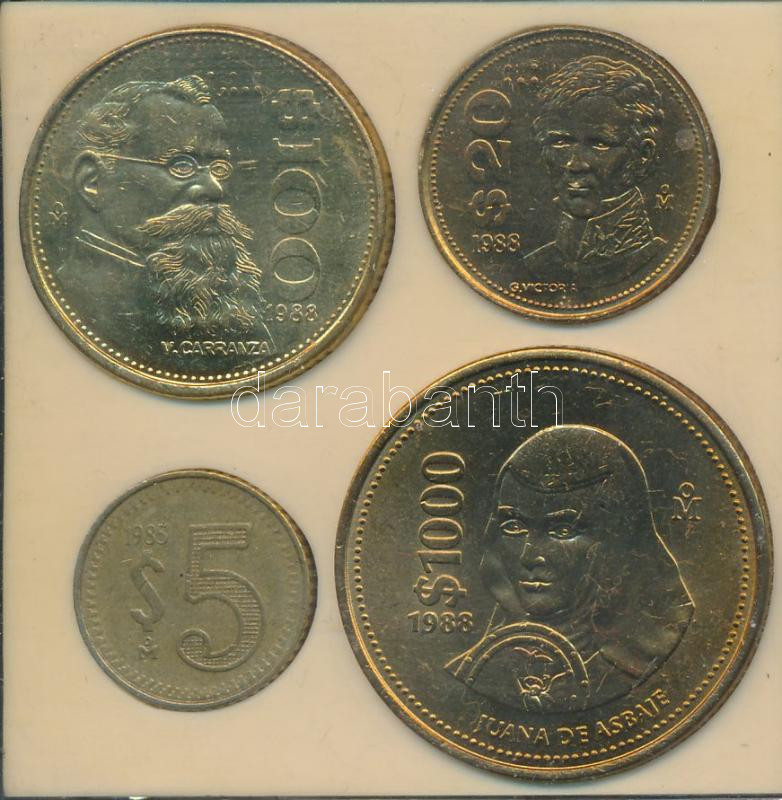 Mexico 1985. 5 Pesos + 1988. 20 Pesos + 100 Pesos + 1000 Pesos in plastic case C:XF