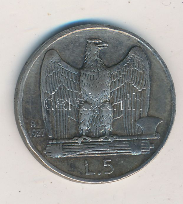 Italy 19... https://www.darabanth.com/hu/251-Gyorsarveres/251.0/Numizmatika/Kulfoldi-fem-es-ezustpenzek~12/Olaszorszag-1927R-5L-Ag-III-Viktor-Emanuel-T2---Italy-1927R-5-Lire-Ag-Vittorio-Emanuele-CVF~II1212344