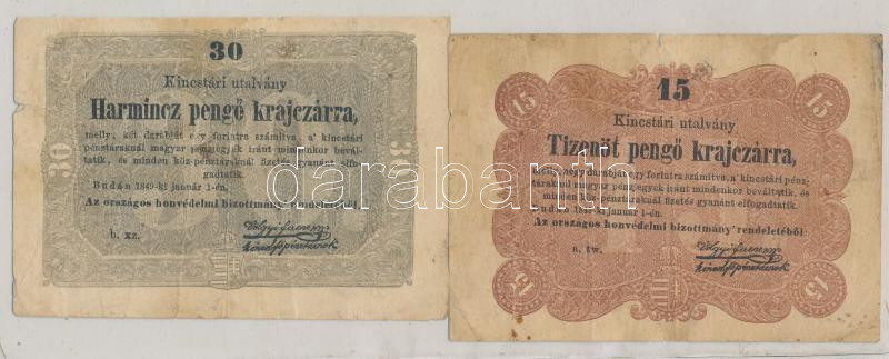 Leírás: 1849. 15kr + 30kr "Kossuth bankó" T:III-,IV egyik vágott