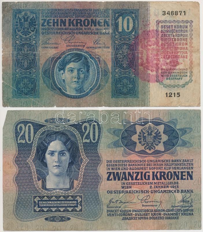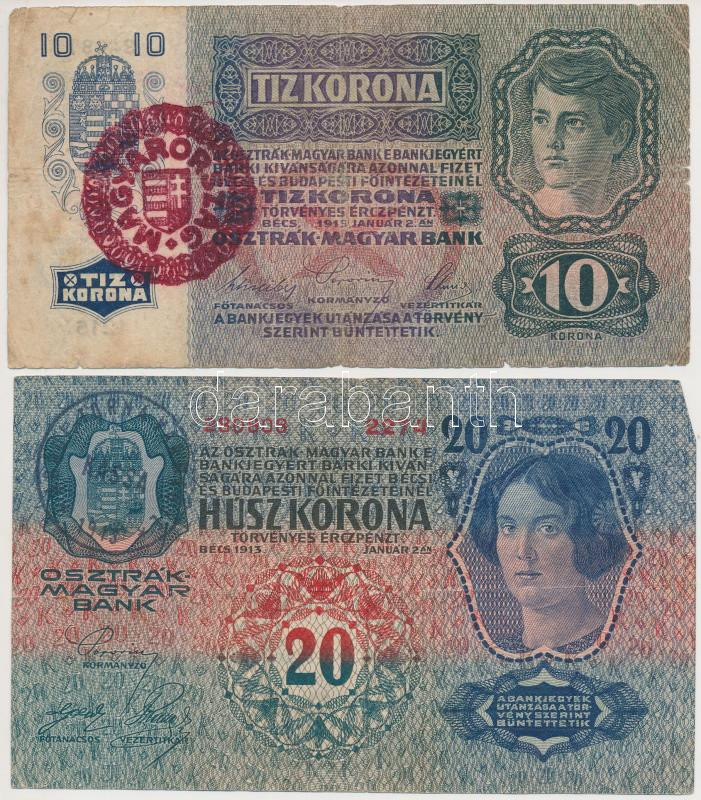 1913. 20K I. kiadás (2x) az egyik hamis piros "Magyarország" körbélyegzővel + 1913. 20K II. kiadás + 1915. 10K piros "MAGYARORSZÁG" felülbélyegzéssel, mindegyik "Abaúj Torna Vármegye Kassa 1913" felülbélyegzéssel / one banknote with fake overprint T:III,III-