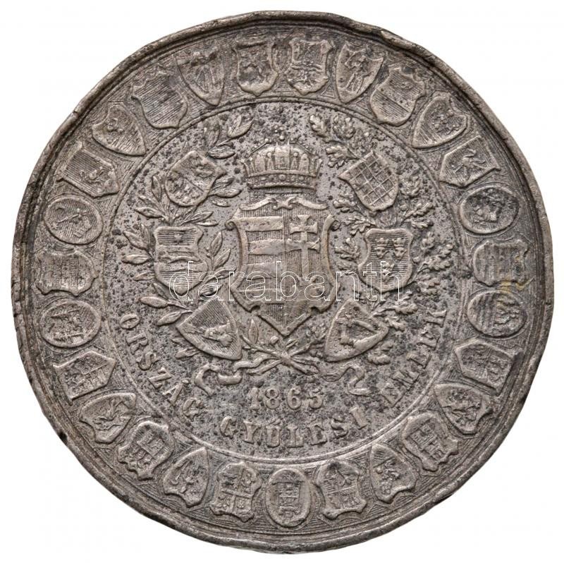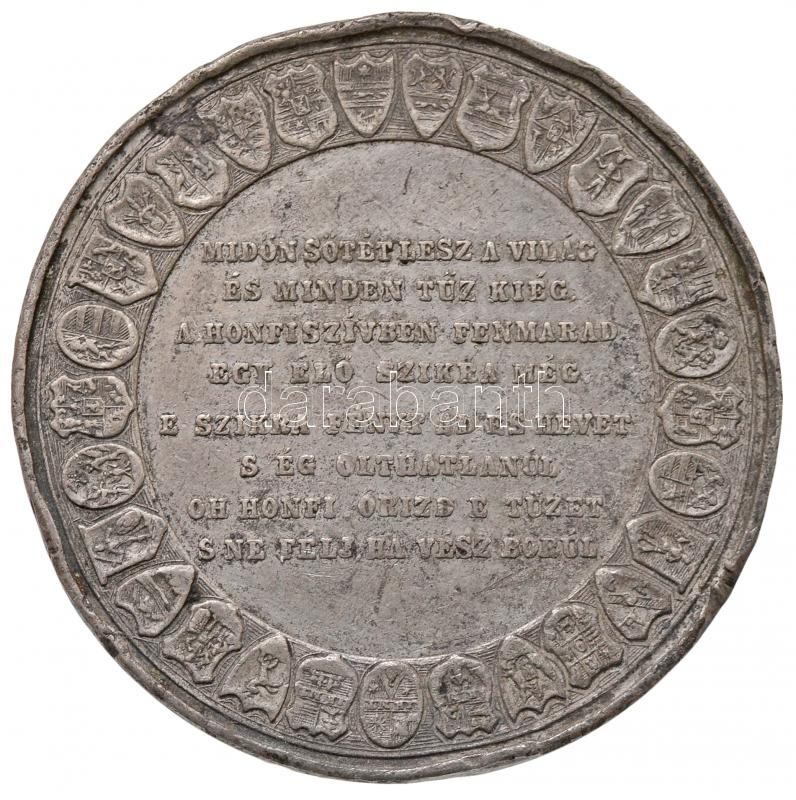1865. "Országgyűlési Emlék" Sn emlékérem. "1865 ORSZÁG GYŰLÉSI EMLÉK / MIDŐN SÖTÉT LESZ A VILÁG - ÉS MINDEN TŰZ KIÉG - A HONFISZÍVBEN FENMARAD EGY ÉLŐ SZIKRA MÉG. - E SZIKRA FÉNYT AD ÉS HEVET - S ÉG OLTHATATLANUL - OH HONFI, ŐRIZD E TÜZET - S NE FÉLJ, HA VÉSZ BORUL." (34.07g/50mm) T:3