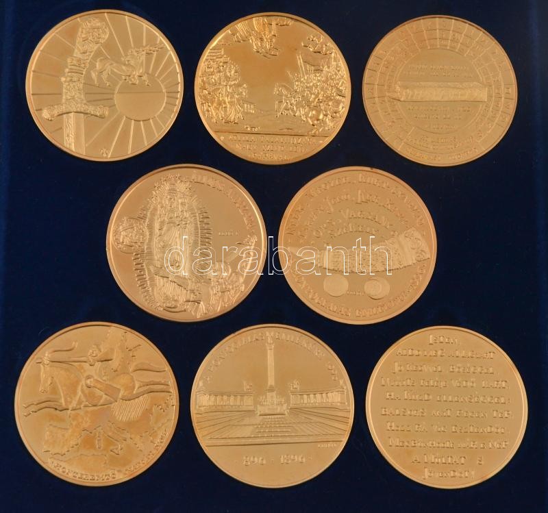 Leírás: 1996. "A magyarok honfoglalásának 1100 éves évfordulója emlékére" 8xklf db-ból álló aranyozott tombak emlékérem szett eredeti dísztokban számozott tanúsítvánnyal. Tartalma: Attila, Attila találkozása Leó pápával, Kik vagyunk, Emese álma, Vérszerződés, Honteremtő hadjáratok, Honfoglalás. (42,5mm) T:PP felületi karc, ujjlenyomatok