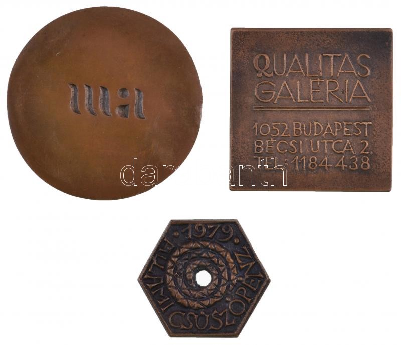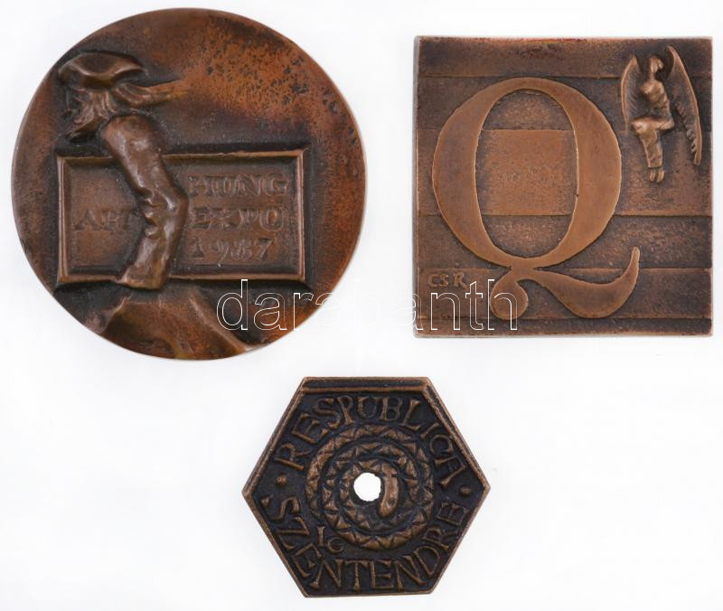 Leírás: 3db-os érem tétel: Kiss György (1943-) 1987. "Hung Art Expo" Br érem (59mm) + Ligeti Erika (1934-) 1979. "Respublica Szentendre / Állami Csúszópénz" Br érem (36mm) + Csíkszentmihályi Róbert (1940-) DN "Qualitas Galéria" Br plakett (50mm) T:2