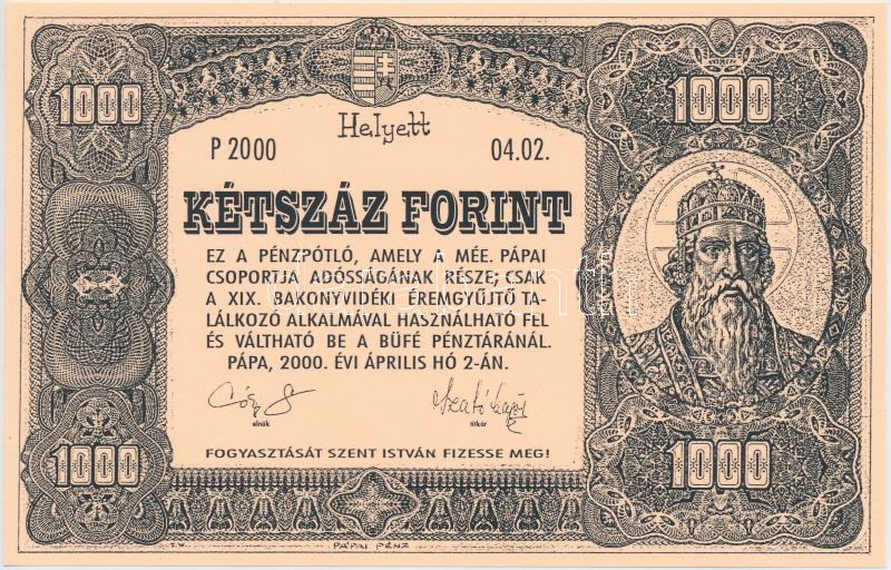 Leírás: 2000. Pápa "19. Bakonyvidéki Éremgyűjtő Találkozó" 200Ft pénzpótló utalvány T:I