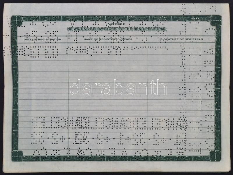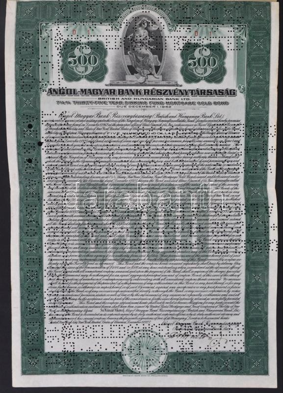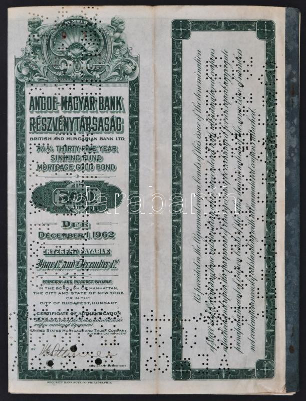 Amerikai Egyesült Államok / New York / Magyarország 1927. "Angol-Magyar Bank Részvénytársaság" 7 1/2%-kal kamatozó aranykötvény 500$-ról angol nyelven szelvényekkel, perforációval érvénytelenítve T:III