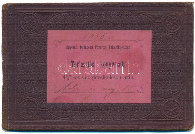 Leírás: Budapest 1896. "Egyesült Budapesti Fővárosi Takarékpénztár" törlesztési könyvecske 4 1/2°-os Záloglevél-kölcsönről