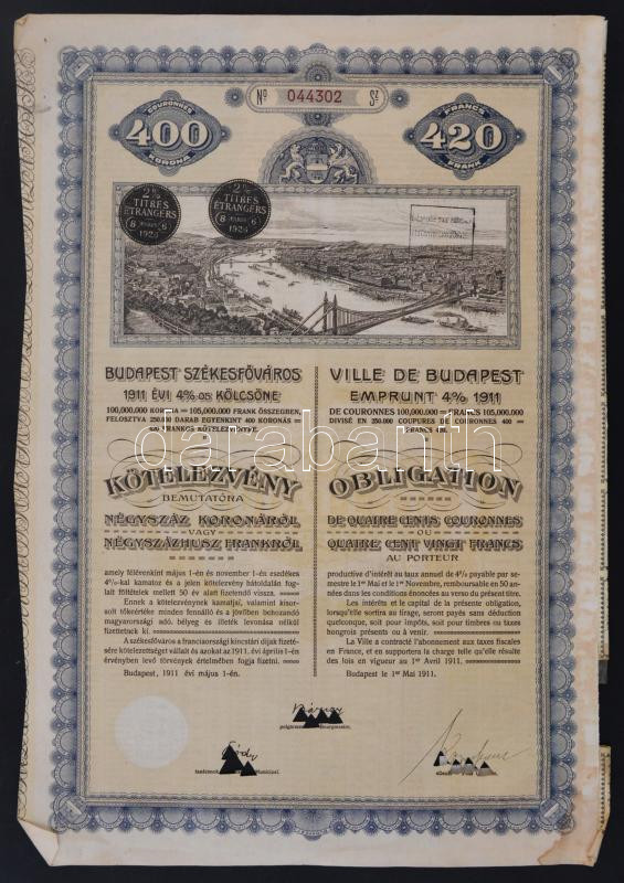 Budapest 1911. "Budapest Székesfőváros" kötelezvénye 400K-ró... https://www.darabanth.com/hu/251-Gyorsarveres/251.0/Numizmatika/Reszvenyek-es-sorsjegyek~5/Budapest-1911-Budapest-Szekesfovaros-kotelezvenye-400K-rol-szelvenyekkel-plus-1913-400K-A-T~II1209146