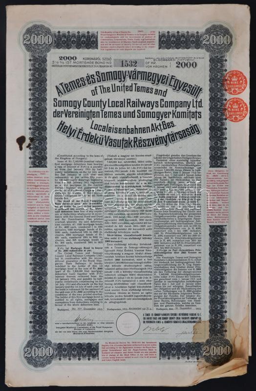 Leírás: Budapest 1911. "Budapest Székesfőváros" kötelezvénye 400K-ról szelvényekkel + 1913. 400K "A Temes- és Somogy-vármegyei Egyesült Helyi Érdekű Vasutak Részvénytársaság" 3 1/2%-os elsőbbségi kötvénye 2000K-ról szelvényekkel T:III ázott papír