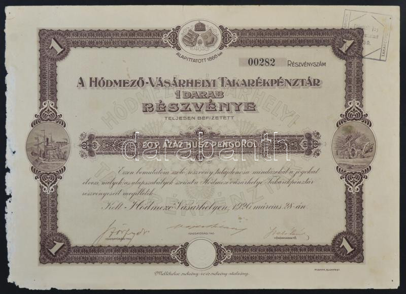 Leírás: Hódmezővásárhely 1926. "Hódmező-Vásárhelyi Takarékpénztár" részvénye 20P-ről, szárazpecséttel, bélyegzéssel T:II-