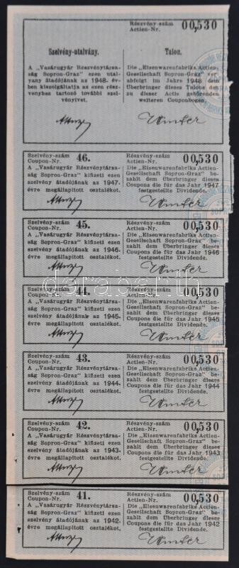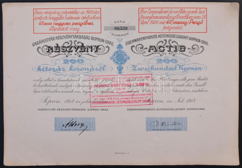 Leírás: Sopron 1918. "Vasárugyár Részvénytársaság Sopron-Graz" részvénye 200K-ról szelvényekkel, felülbélyegzéssel T:II-