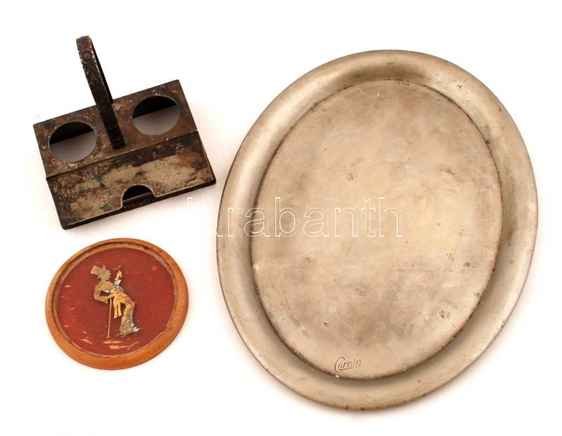 Leírás: Corvin feliratú alpakka tálca, üveg plakett, fém só- és borstartó szóró nélkül