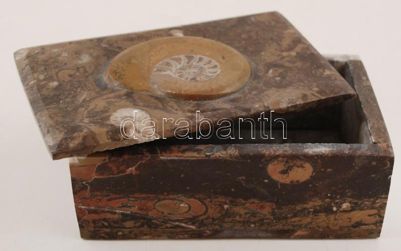 Leírás: Fosszilis mészkőből (Atlasz-hegység, Marokkó) készült dekoratív doboz, benne ammonites-maradványokkal, 12,5×8×5,5 cm