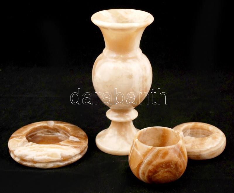 Leírás: Különféle ónixtárgyak: virágtartó, mécsestartó, hamutartók, összesen 4 db, különböző méretben
