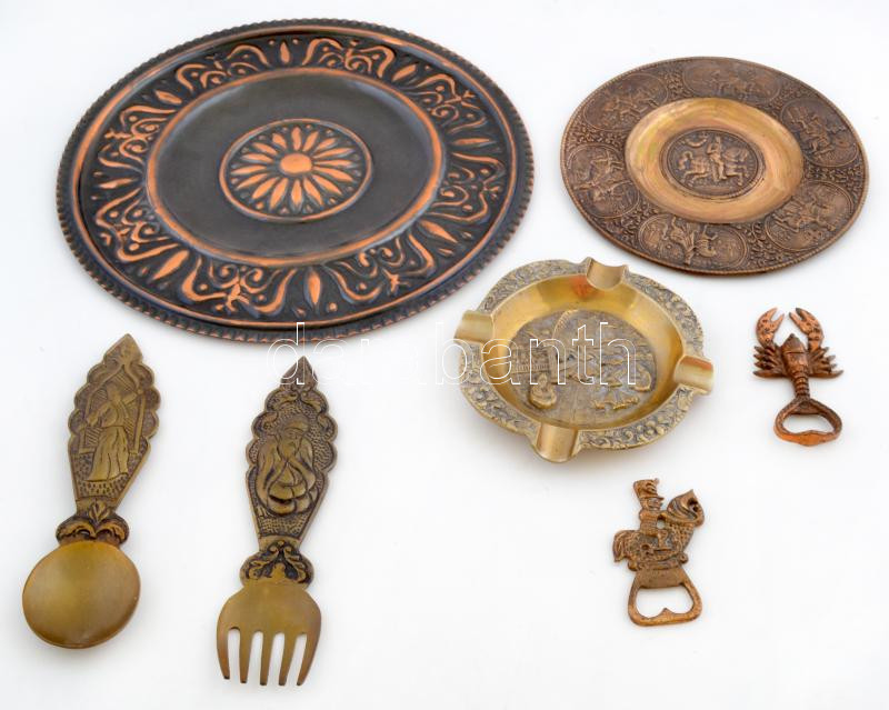 Leírás: Réz tárgyak: 2 fali tányér, 2db sörnyitó, hamutál, kanál, villa, összesen: 7 db