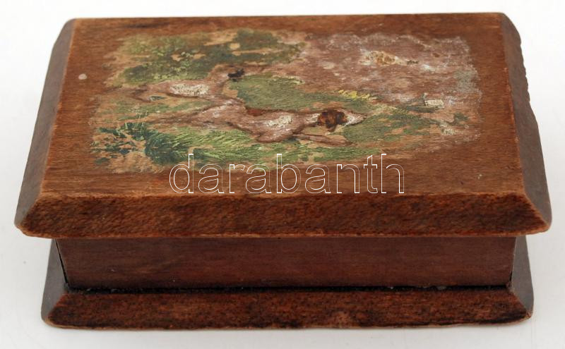 Leírás: Vadászjelenetes antik fa doboz, kézzel festett, kis hibával, 10x6x3cm
