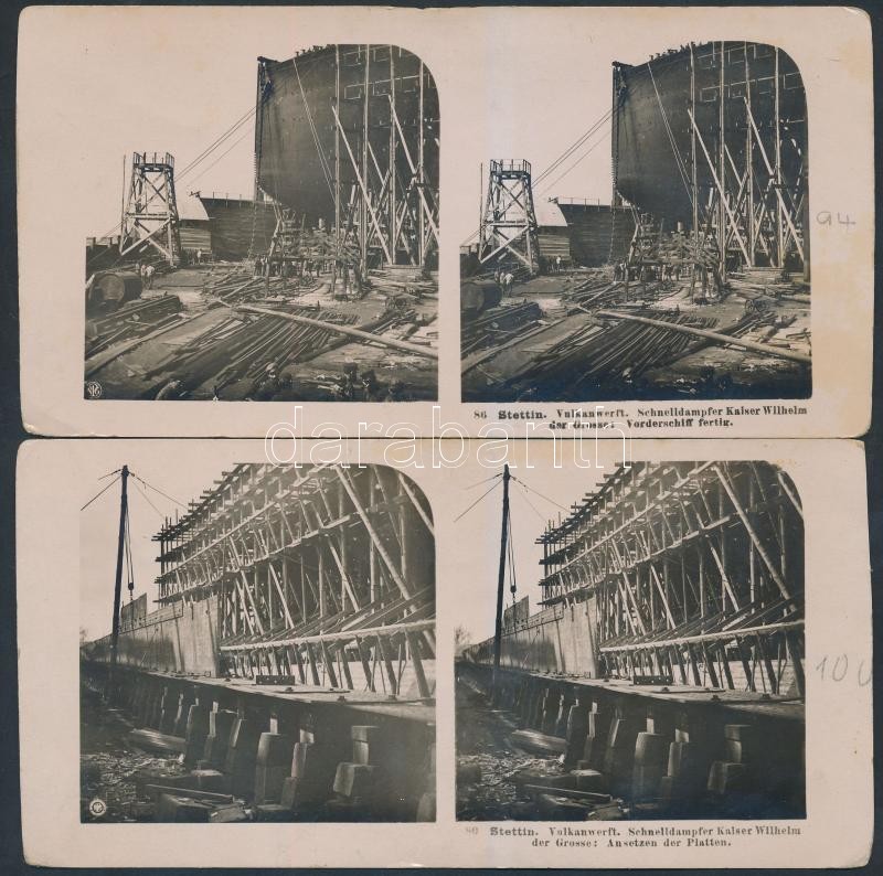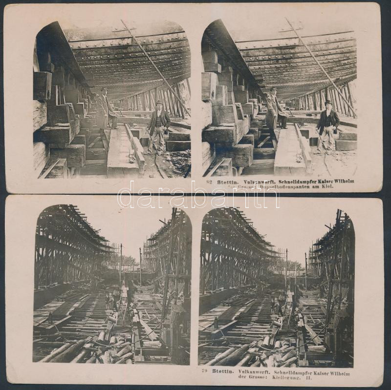 cca 1903 Sztereófotók a Vilmos császárról elnevezett "gyorsgőzös" építéséről, Stettin(Szczecin)4 db, 9x18 cm / cca 1903 Szczecin, Poland, Building of Kaiser Wilhelm steamship, 4 photos, 9x18 cm