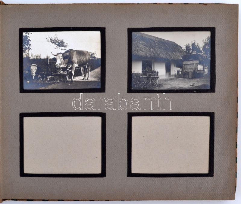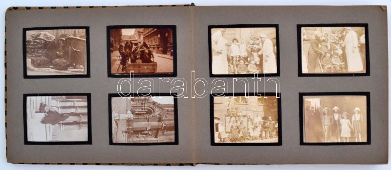 cca 1910 Fotóalbum 57 db emlékképpel, budapesti és falusi látképpel, szociofotóval, jó minőségű, de feliratok nélküli privát fénykép gyűjtemény, ami további kutatásra érdemes, 4x5,5 cm, album 14x17 cm