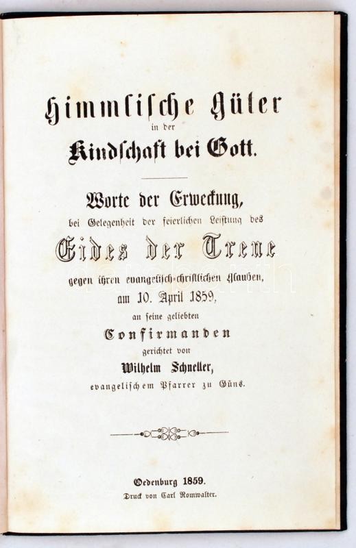 Himmlische Güter in der Kindschaft bei Gott. Worte der Erwechnung, bei er feierlichen Leistung des Fides der Treue gegen ihren evangelisch-christlichen Glauben am 10. April 1859, an seine geliebten Cinfirmanden gerichtet von Wilhelm Schneller evangelischem Pfarrer zu Güns. Oedenburg, 1859, Druck von Carl Romwalter. DEDIKÁLT!(with dedication). Kartonált kötés, jó állapotban / paperback, good condition