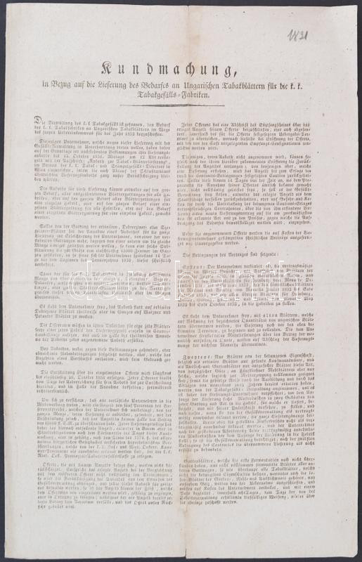 Leírás: 1831 A dohánylevelek dohánygyárba való szállításával kapcsolatos hirdetmény német nyelven
