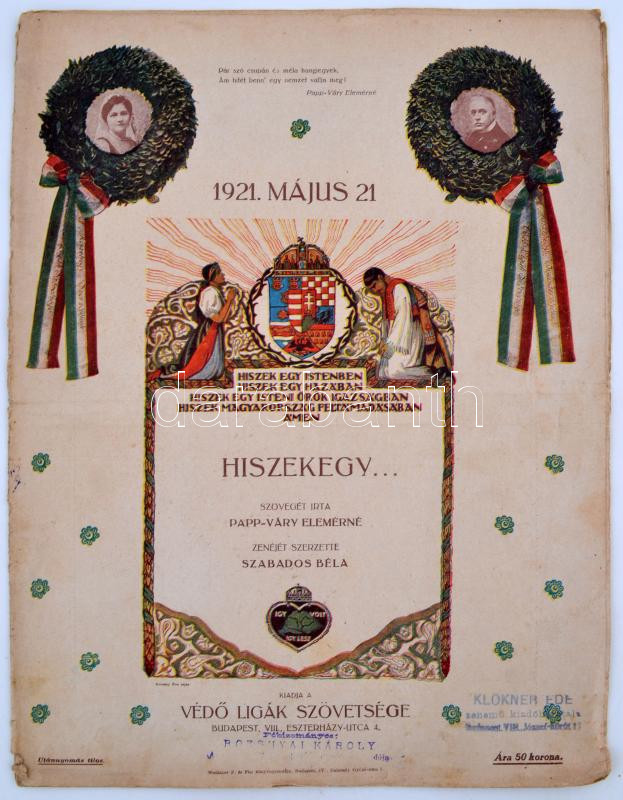 1921 A Magyar Hiszekegy zenéjének és szövegének hivatalos kiadása. Kia... https://www.darabanth.com/hu/252-Gyorsarveres/252.0/Festmeny-mutargy-papirregiseg-egyeb/Nyomtatvanyok~800006/1921-A-Magyar-Hiszekegy-zenejenek-es-szovegenek-hivatalos-kiadasa-Kiadja-a-Vedo-Ligak-Szo~II1219661