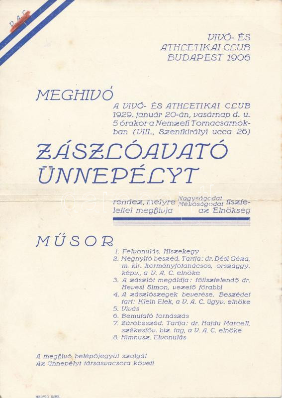 1929 Bp., Meghívó a Vívó- és Athletikai Club zászlóavató ünnepélyére https://www.darabanth.com/hu/252-Gyorsarveres/252.0/Festmeny-mutargy-papirregiseg-egyeb/Nyomtatvanyok~800006/1929-Bp-Meghivo-a-Vivo-es-Athletikai-Club-zaszloavato-unnepelyere~II1221049