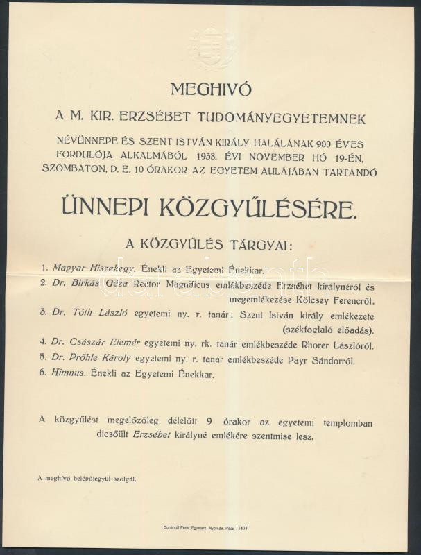 1938 Meghívó a M. Kir. Erzsébet Tudományegyetem ünnepi közgyűlésére, 2... https://www.darabanth.com/hu/252-Gyorsarveres/252.0/Festmeny-mutargy-papirregiseg-egyeb/Nyomtatvanyok~800006/1938-Meghivo-a-M-Kir-Erzsebet-Tudomanyegyetem-unnepi-kozgyulesere-26x20cm~II1217950