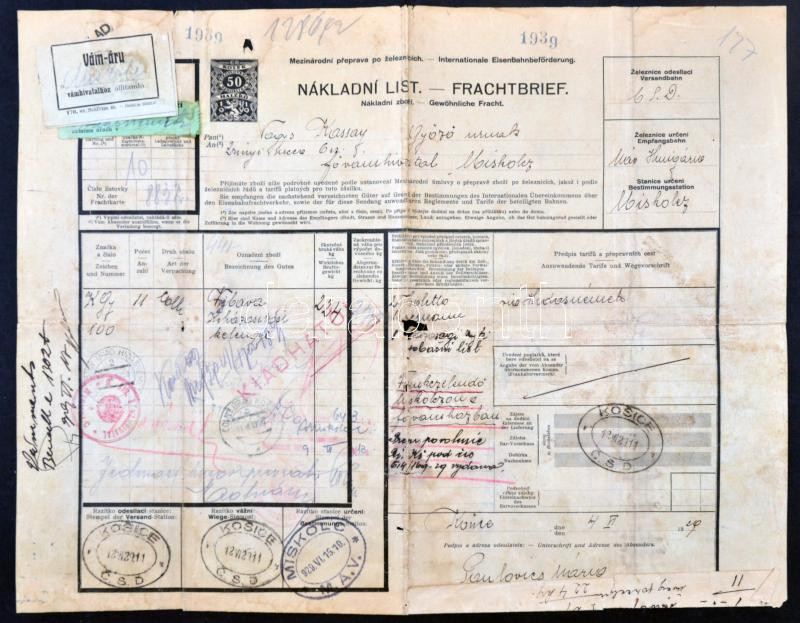 Leírás: 1929 Vámáru szállítólevél Kassa-Miskolc