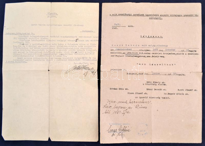 1945-1947 Csendőralhadnagy nemleges igazolása a háború után, hozzá még... https://www.darabanth.com/hu/252-Gyorsarveres/252.0/Festmeny-mutargy-papirregiseg-egyeb/Okmanyok~800029/1945-1947-Csendoralhadnagy-nemleges-igazolasa-a-haboru-utan-hozza-meg-egy-dokumentum-a-nyugd~II1220373