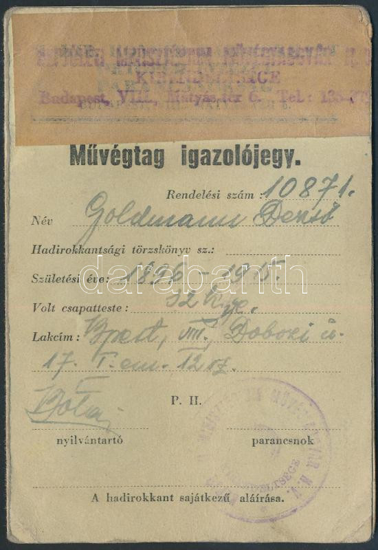 Leírás: cca 1950 Művégtag igazolójegy, Népjóléti Minisztérium Művégtaggyár,12x8cm
