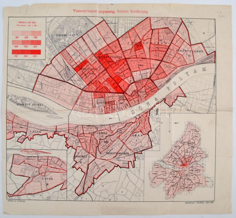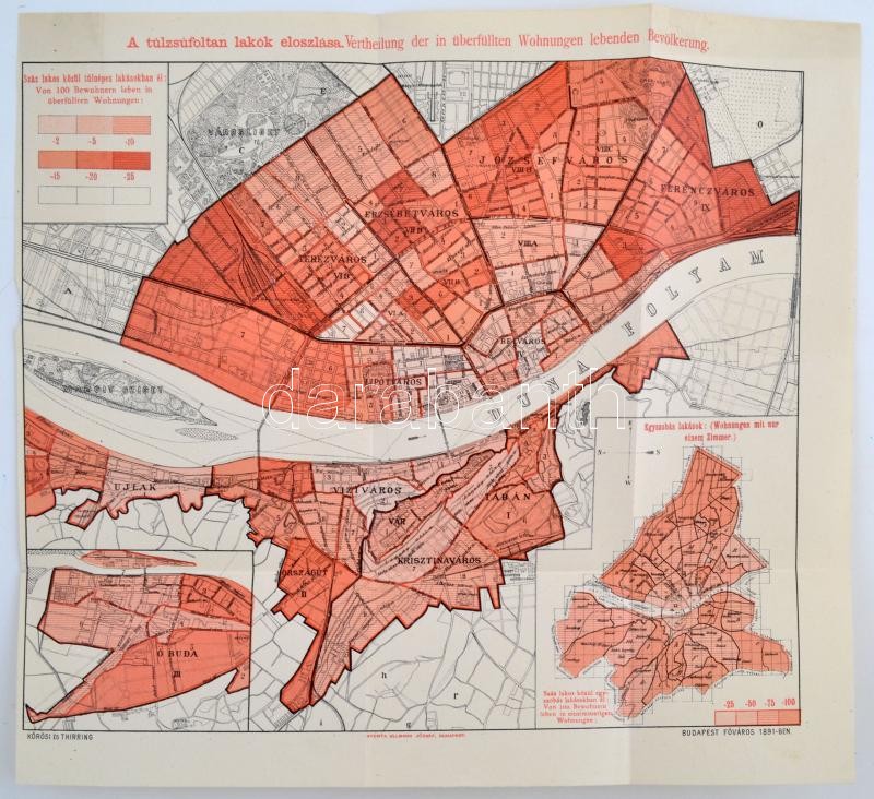 1891 Budapest Főváros érdekes térképek: "A túlzsúfoltan lakók elosztása, A szobák lakottsága, Viszonylagos népesség, Beépített terület, 4db különböző méretben és minőségben, 34x37cm, 27x37cm